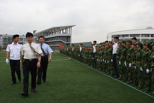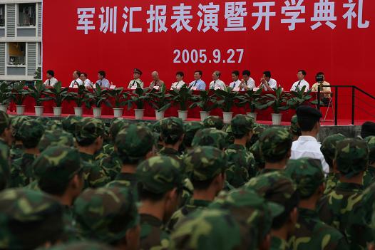 2005年新生军训汇报表演暨开学典礼昨天早上在雨中进行。市委副书记、学院临时党委书记刘树基,学院临时党委副书记、院长杨晓西,全国政协常委、中国科学院院士、我院兼职教授蔡睿贤,中国科学院士、我院双聘院士徐建中教授等领导冒雨检阅了新生军训成果,并出席开学典礼。