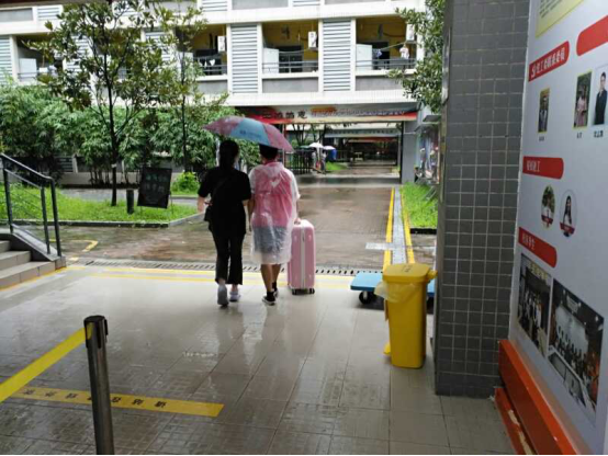 老师们在雨中为毕业生接送行李